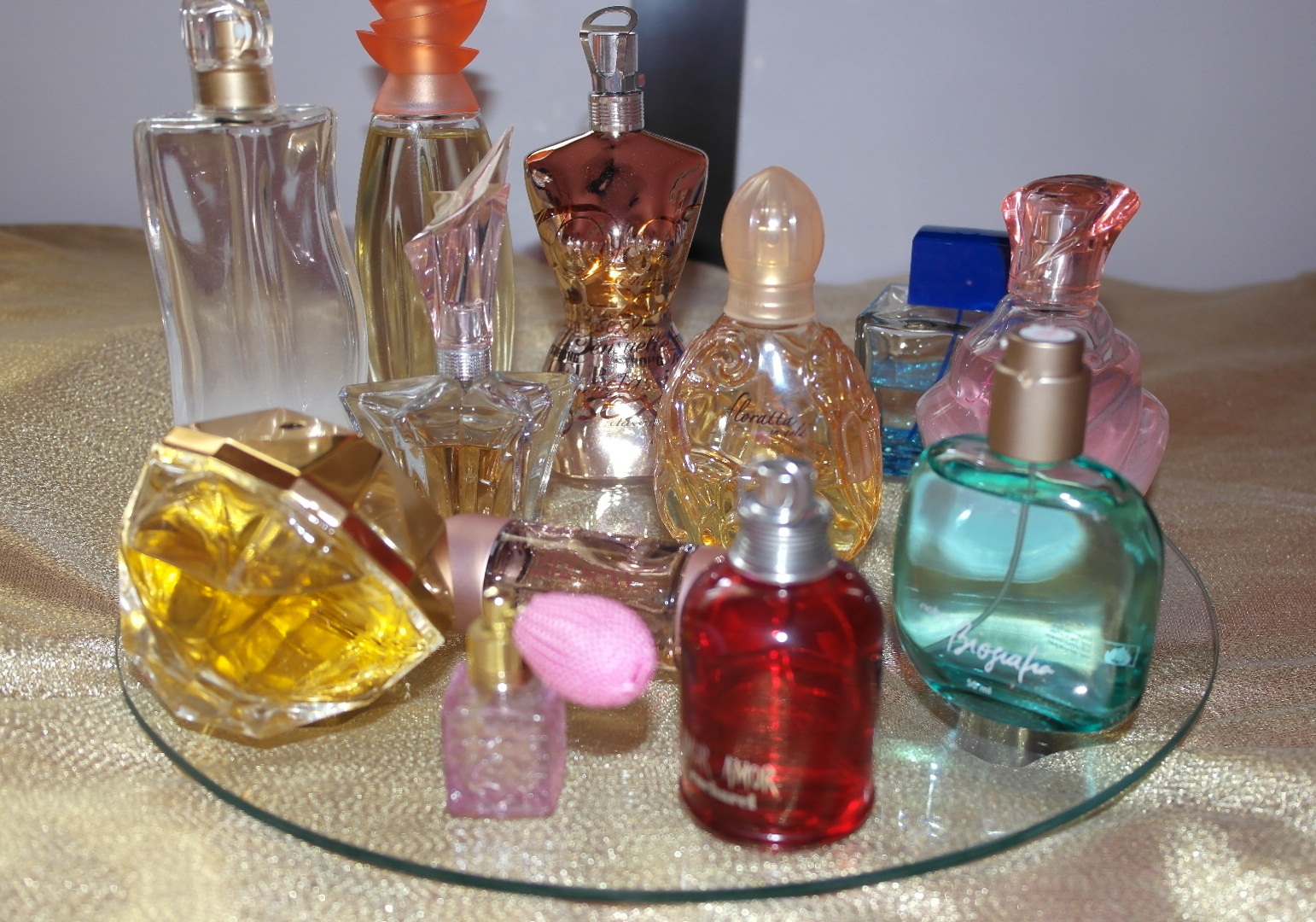 Você pode utilizar qualquer tipo de bandeja que te agrade, essa que eu utilizei, é uma bandeja para colocar salgadinhos e docinhos que tem aqui em casa. Os perfumes ficaram bem distribuídos e como a bandeja é em vidro deu um charme nos perfumes e o mais interessante que a bandeja serve para decorar o seu quarto e até mesmo organizar os seus perfumes. Essa decoração pode ser feita no banheiro, que por sinal fica ótimo.