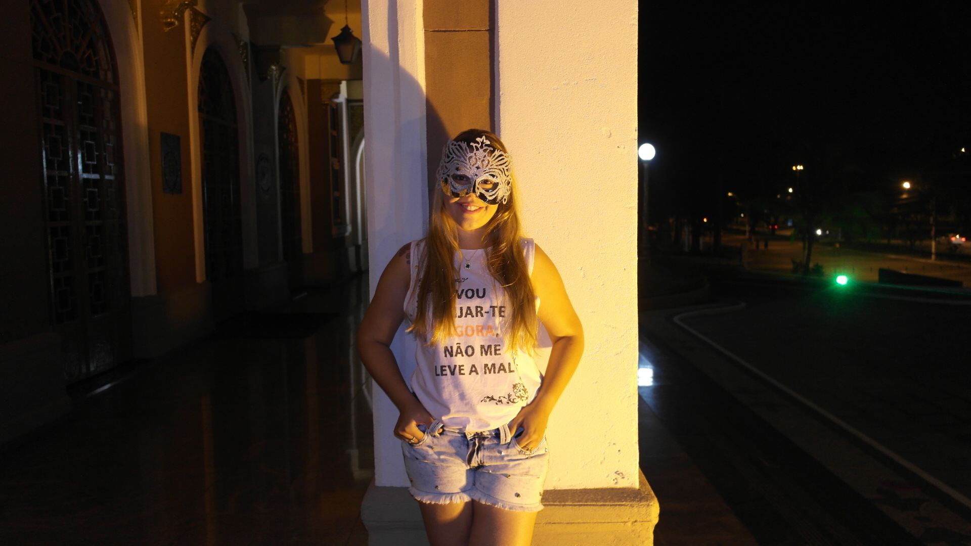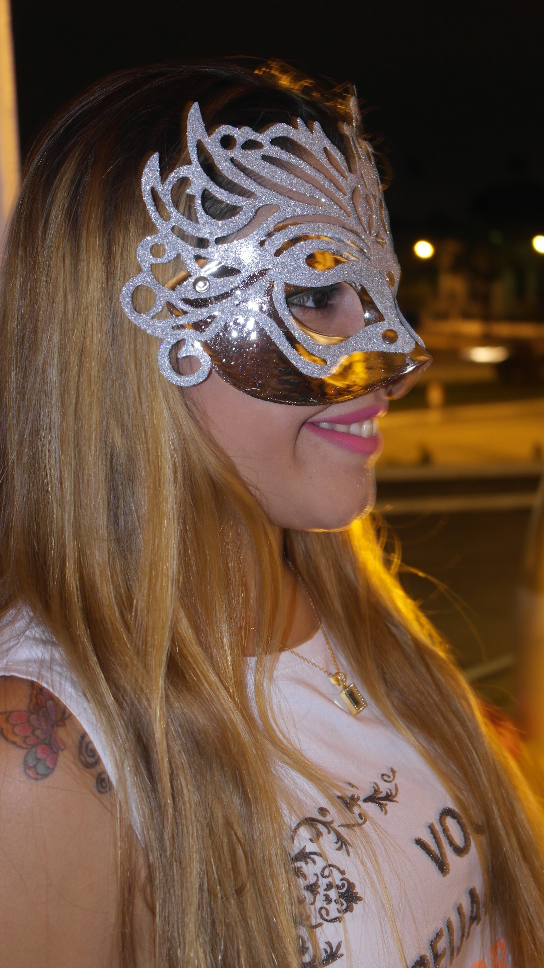 Resolvi colocar uma máscara prata que além do mais é muito bonita, que vem com glitter e por ser uma máscara diferente ela chama atenção e fica muito bem no rosto. Resolvi também fazer o meu primeiro look à noite e amei o resultado, pois a iluminação ajudou muito e as fotos ficaram lindas.