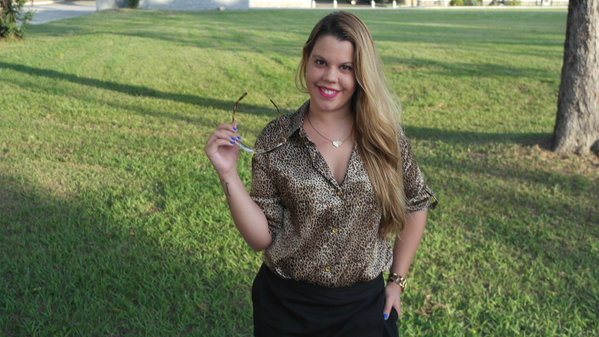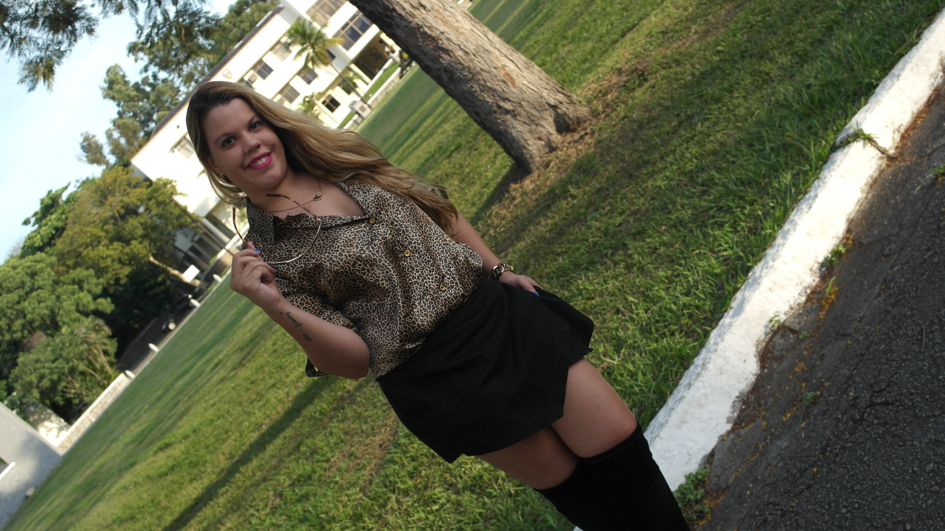 Resolvi aderir duas peças no look que estão em alta no outono/inverno, o animal print seja qual for a estação, ele vem com mais força e seja qual for a estampa do animal print realça mais a cor da nossa pele e para compor o look resolvi colocar um short saia preto, para equilibrar o look, dando um destaque total na bota acima dos joelhos.