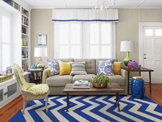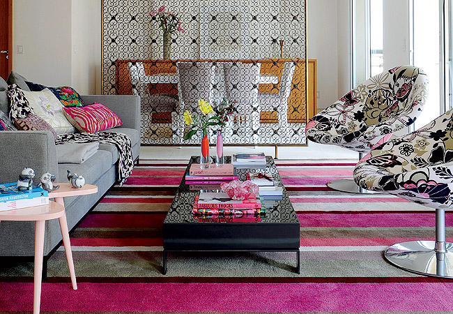 Já falei aqui no blog sobre as estampas chevron, que eu acho super lindo, super chique e deixa o ambiente super agradável, super bonito e você pode usar uma sala clara com um tapete de estampa chevron dando a atenção total no tapete, ou tapete com listras, cores extravagantes, onde possa deixar o ambiente mais divertido, mais glamouroso.