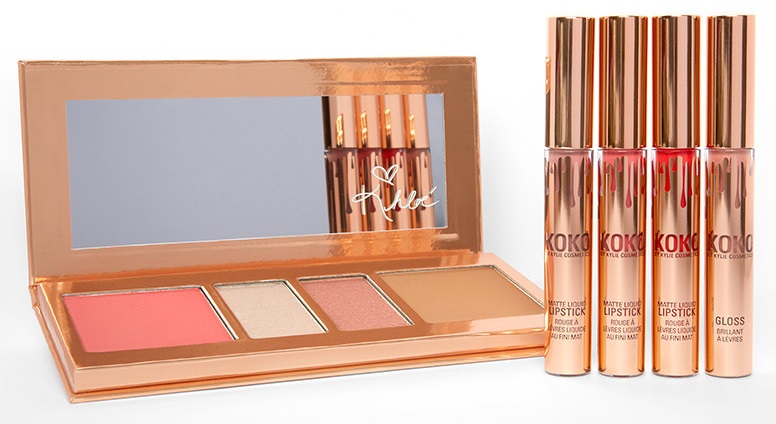 A coleção tem três batons líquidos matte, um gloss e uma paleta facial com blush, iluminador e contorno. Vocês podem comprar o combo que é a coleção toda ou pode comprar item por item. As embalagens continuam com a mesma pegada da primeira coleção, todas douradas com o apelido da Khloé estampado.Os batons matte são: Doll (tangerina vibrante); Bunny (malva com fundo acinzentado) e Baby Girl (rosa neon) e o gloss Sugar Plum (pêssego com brilho). O blush da paleta facial se chama Rodeo Drive (rosa quente), bronzer Hollywood Blvd (marrom opaco) e os iluminadores Troop Beverly Hills (champagne) e o 90210 (dourado cintilante).