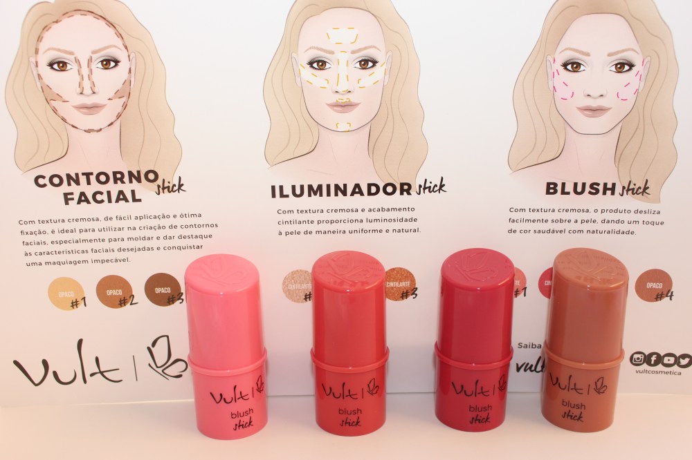 A linha de stick blushs é composta por 4 cores, 3 cintilantes e 1 opaca, com uma textura bem cremosa, deixando a cor bem natural sobre a pele. A embalagem é em formato de stick por ser mais prático para aplicar e com tamanho ideal para levar na bolsa.