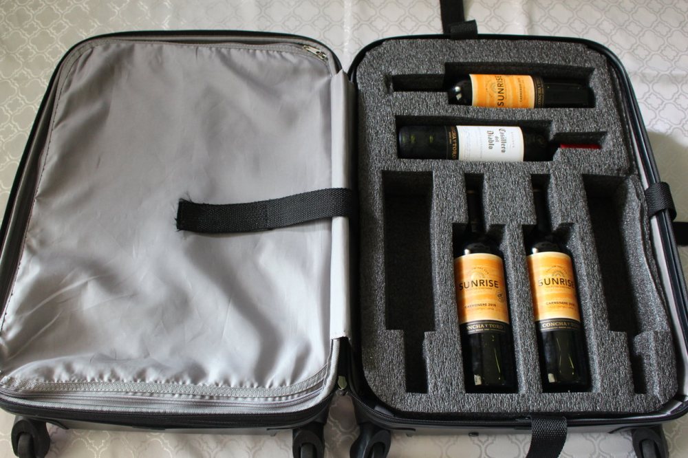 Pegamos uma mala de mão e uma mala de vinho, isso mesmo, uma mala de vinho. 🍷