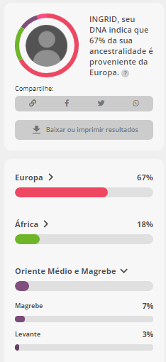 Eu fiquei muito surpresa com o meu resultado. Eu estava mega ansiosa e foi muito bom saber um pouco mais sobre os meus ancestrais. O resultado da minha irmã deu um pouco diferente do meu, mas isso é totalmente normal.