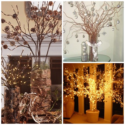 Uma árvore com alguns galhos secos e decorados com  pinhos e bolas de diversos tamanhos que você mesma tem em casa.