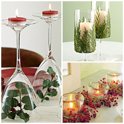 Para os enfeites de mesa que tal escolher vidros? Como copos, taças, vasilhas ou até mesmo pratos? E as velas podem ser aquelas super simples e com um pequeno toque faz com que ela se transforme em um pelo arranjo.