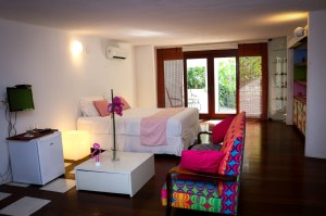 O Hotel Boutique Les Jardins de Rio fica na Rua Cosme Velho, 1342 – Cosme Velho, bem pertinho da entrada do Cristo Redentor, cerca de 1km a pé e localizado no meio da mata atlântica. O hotel possui 8 suítes (os nomes dos quartos são cores). Nós ficamos no quarto rosa (suíte premium) com ar condicionado, TV LCD, Wi-Fi, Banheira e Frigobar.O Hotel era uma casa que foi construída em 1970 pelo arquiteto Roberto Bastos Cruz, que foi aluno de Oscar Niemeyer, com estilo escandinava, com muito banco, madeira e curvas sinuosas e em 2014 a francesa, artista plástica Dany Ballin comprou a casa, reformou e deu o seu toque no design de interiores, para manter a sensação de paz e tranquilidade e ela conseguiu, porque eu só senti paz no hotel.