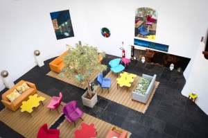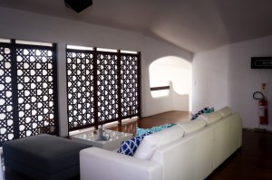 As áreas comuns do Hotel são aconchegantes. Eu fiquei encantada por essas mesas de centro coloridas de quebra-cabeça, deu um toque maravilhoso nessa sala.