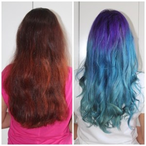 Eu resolvi fazer um cabelo sereia, em degradê deixando a raiz natural para não castigar tanto e começando pelo roxo, azul escuro e azul mais claro.